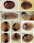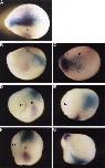 Fig1. Expression patterns of HoxA1 and HoxD1. Expression was examined by whole mount in situ hybridization as described under Materials and Methods. In all cases anterior is left. (A) HoxA1 expression: mid-neurula (Stage 15) lateral view. Black arrows, anterior and posterior boundaries of HoxA1 expression. (B) HoxA1 expression: mid-neurula (stage 17) dorsal view. sc, spinal cord; arrows, anterior and posterior boundaries of expression. (C) HoxA1 expression: tailbud (stage 24), lateral view. sc, spinal cord; arrow, anterior boundary of spinal cord expression. (D) HoxA1 expression: late tailbud (stage 30), lateral view. el, endolymphatic duct; hb, hindbrain; mb, midbrain. (Inset) HoxA1 expression relative to en-2. Closed arrows, HoxA1 expression; open arrow, en-2 expression. (E) HoxD1 expression: mid gastrula (stage 11) dorsal view. bp, blastopore; arrow dorsal lip. (F) HoxD1 expression: mid gastrula (stage 11), ventral view. (G) HoxD1 expression: early neurula (stage 13), dorsal view. (H) HOXD1 early neurula (stage 13), lateral view.(I) HoxD1 expression: mid neurula (stage 16), dorsal view. (J) HoxD1 expression: mid neural (stage 16), lateral view. Arrow, anterior boundary of expression.