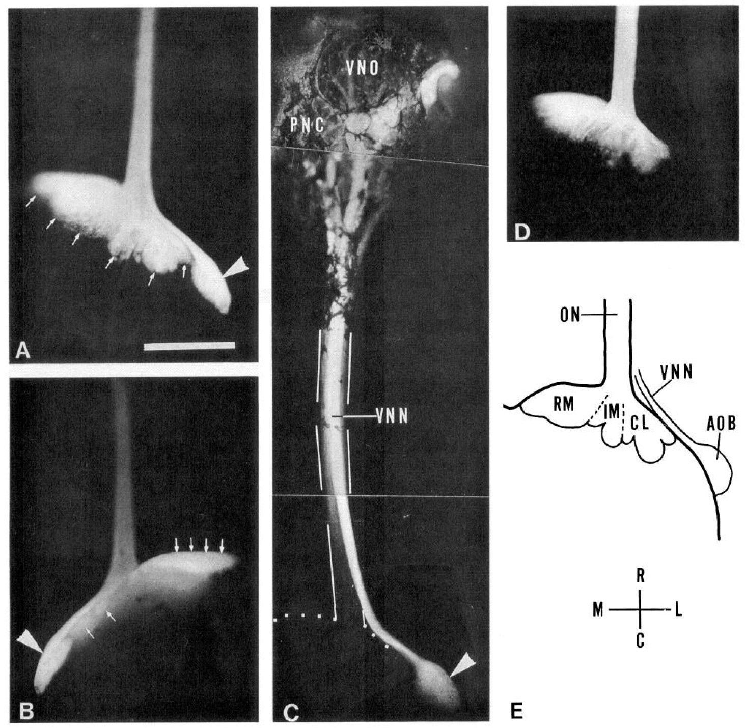 MAbB2. C, The vomeronasal nerve (a large arrow) is stained with MAbB2. Bundles of the principal olfactory axons (smd arrows) are also stained