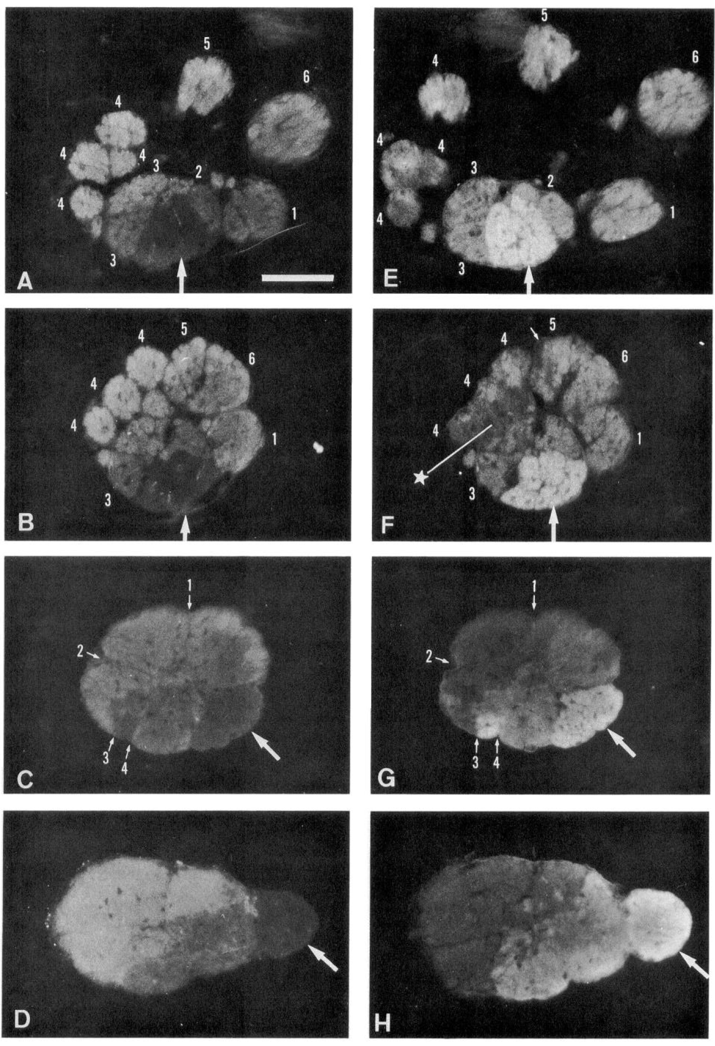 the retrograde labeling of the OFBs with the dye (a dorsal view of the left nasal chamber). The numbers I-6 indicate the dye-positive areas after