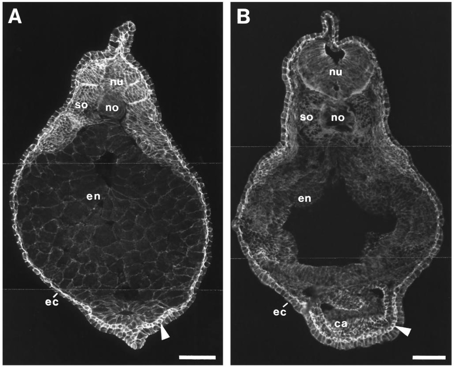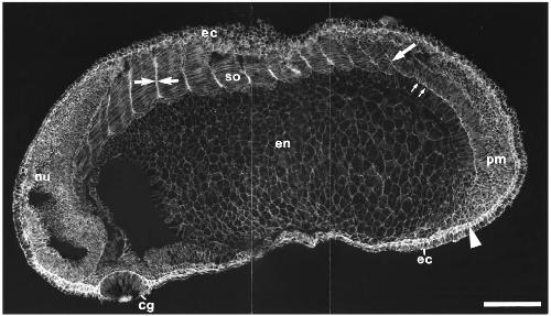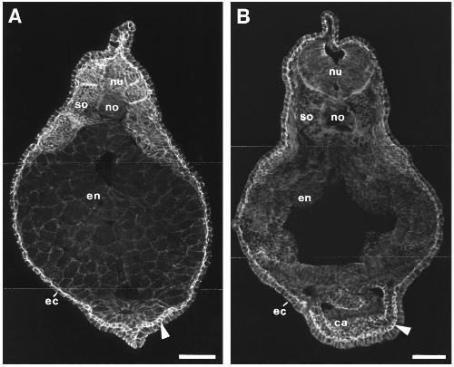 ectoderm; en, endoderm; no, notochord; nu, neural tube; so, somites; arrowheads, inner layer of the ectoderm. Bars, 200 um.