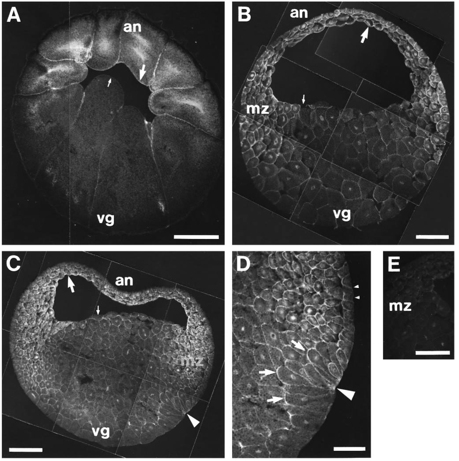 non-immune rabbit serum. Bars = 200 mm (A-C, E) and 100 mm (D). an, animal pole; vg, vegetal pole; mz, marginal zone.