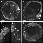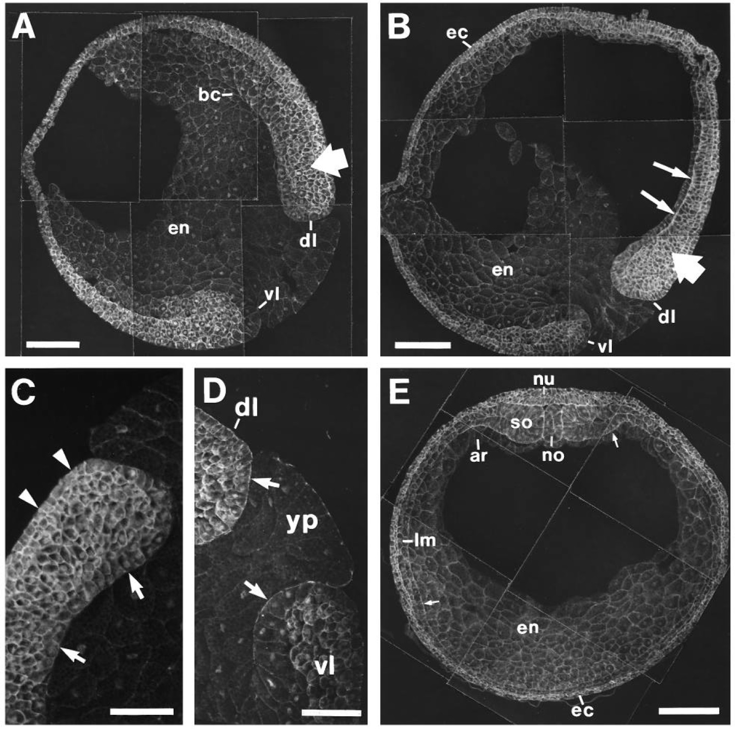 blastopore; yp, yolk plug. Bars = 200 um (A,B,E) and 100 um (C,D).