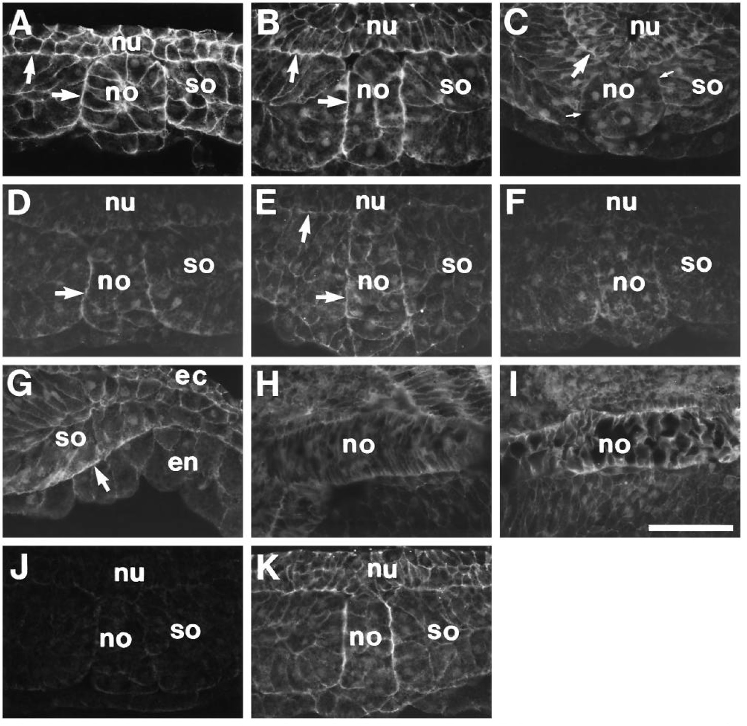 protein (J) or GST protein alone (K). ec, ectoderm; en, endoderm; no, notochord; nu, neural plate and tube; so, somitic mesoderm. Bar, 100 um.