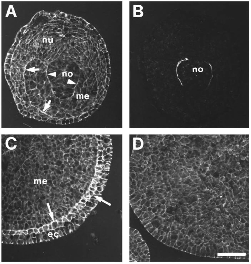 is distributed homogeneously over the whole tissue. ec, ectoderm; me, mesoderm; no,