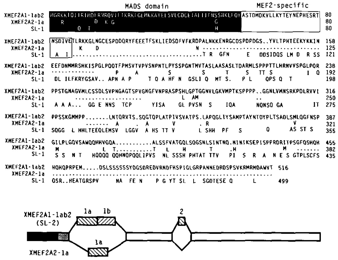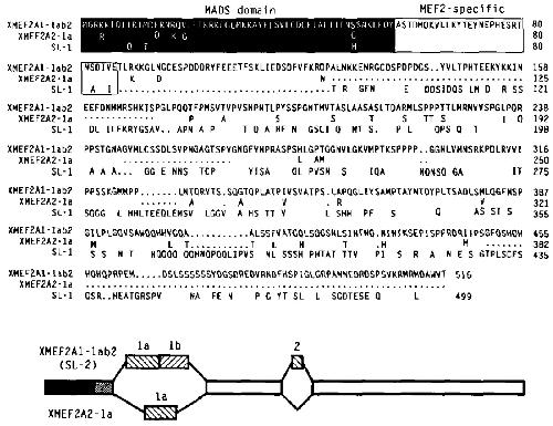 lab2 (XMEF2Al), XMEF2A2-1a (XMEF2A2), and SL-1. The complete sequence of XMEF2Al is shown on the top line. Amii1o acid differences