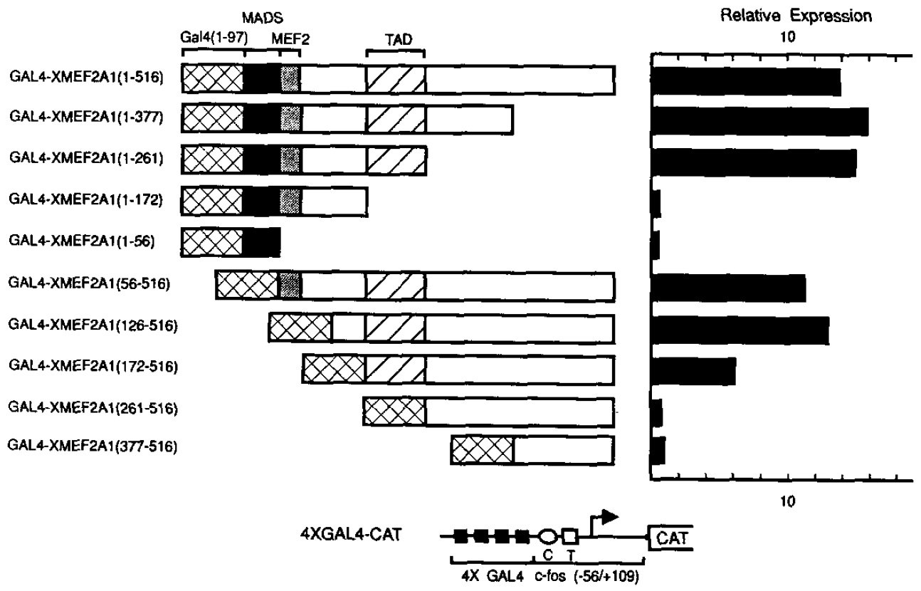 FIG. 6. Identification of a transcriptional activation domain using GAL4-XMEF2A 1 gene fusions. The full-length XMEF2Al and a series ofNterminal