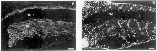 enlarged and laterally disordered myotomes (m) on the injected s ide (bottom). (B) Hoechst stain of the same section as in (A) demonstrating