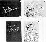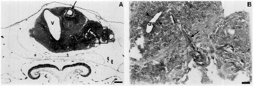 normal vetricle (v), and accessory ventricles (arrows) of the brain. Bar, 50 /.lm. (B) Higher magnification of enclosed area in (A) showing