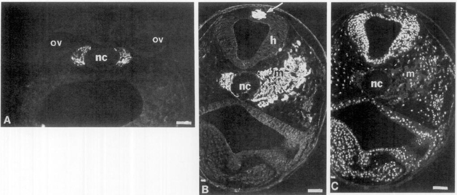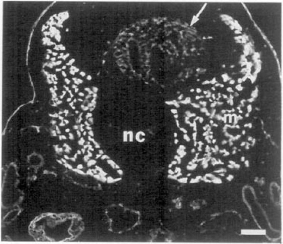 an enlarged left myotome (m) on the injected side. nc, notochord. Bar,
