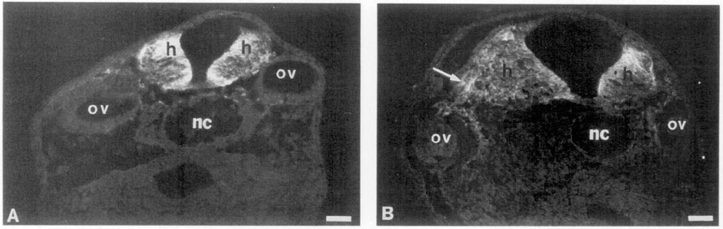 presence of ectopic labeling (arrow) in the dorsal region of the hindbrain (h). (C) Hoechst staining of the same section as in (B) illustrating