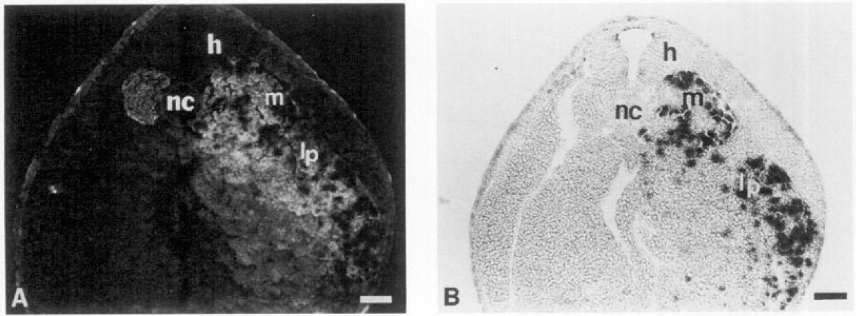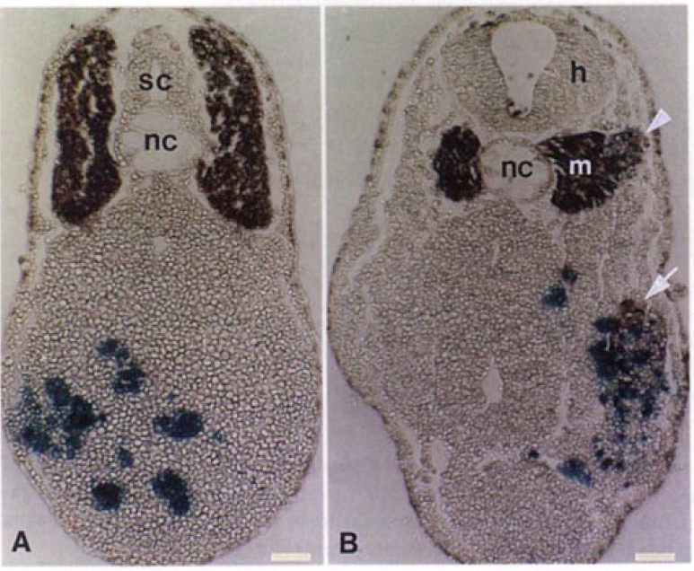 (h) region iHustrating an (A) enlarged cranial myotome (m) and (B) the distribution of the injected RNAs. Section through the anterior trunk