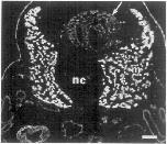 enlarged hindbrain (hand arrow) composed of 2G9 positive cells. nc, notochord. Bars, 50 um.