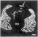 (nc) and spinal cord (sc) and the enlarged myotome (m) and