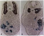ng) illustrating the restriction of actin (5C5 antigen) to the normal myotomes. (B) Cross section through the hindbrain r egion of a stage 35/36