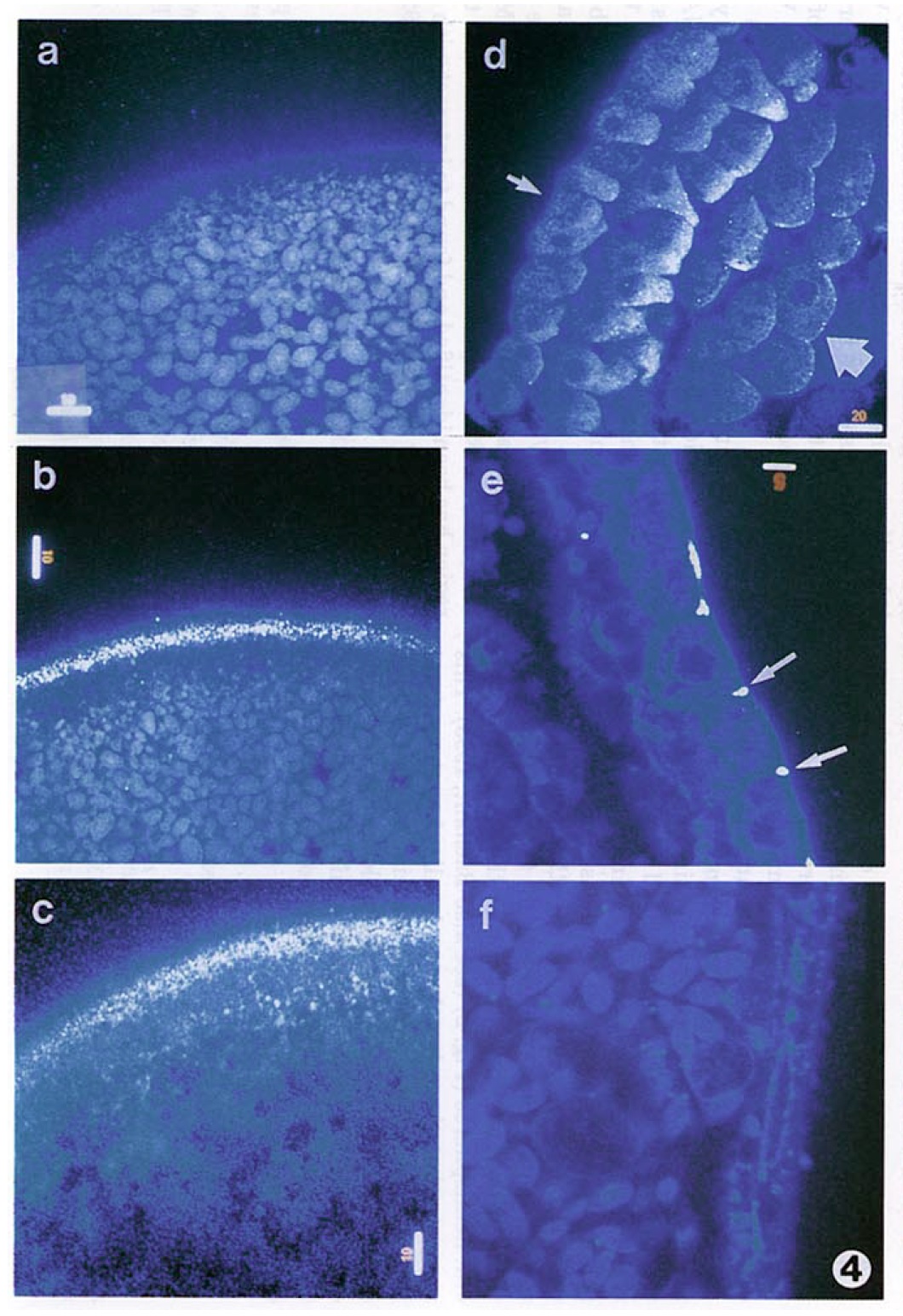 regions of the lateral membrane of ectodermal cells (arrows). In the absence of primary antibody (f) there is no such staining (embryos in e and