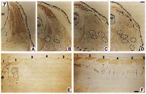 and F) Sagittal sections of dorsal muscles at stage 59 (E) and stage 61 (F) were immunostained with TM228. The numbers (1-61 show the