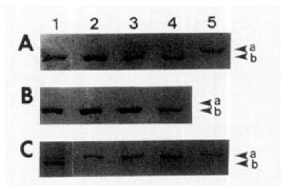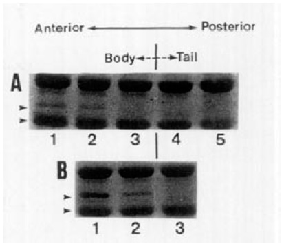from tadpoles at various stages (lane 1, stage 55; lane 2, stage 58; lane
