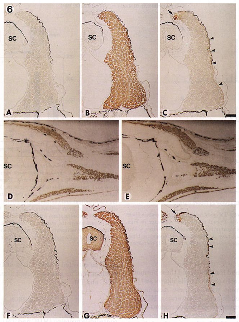 (H). Sections in A and Fare negative cont rols (no primary antibody). SC, spinal cord. Arrows and arrowheads inC and H show area expressing