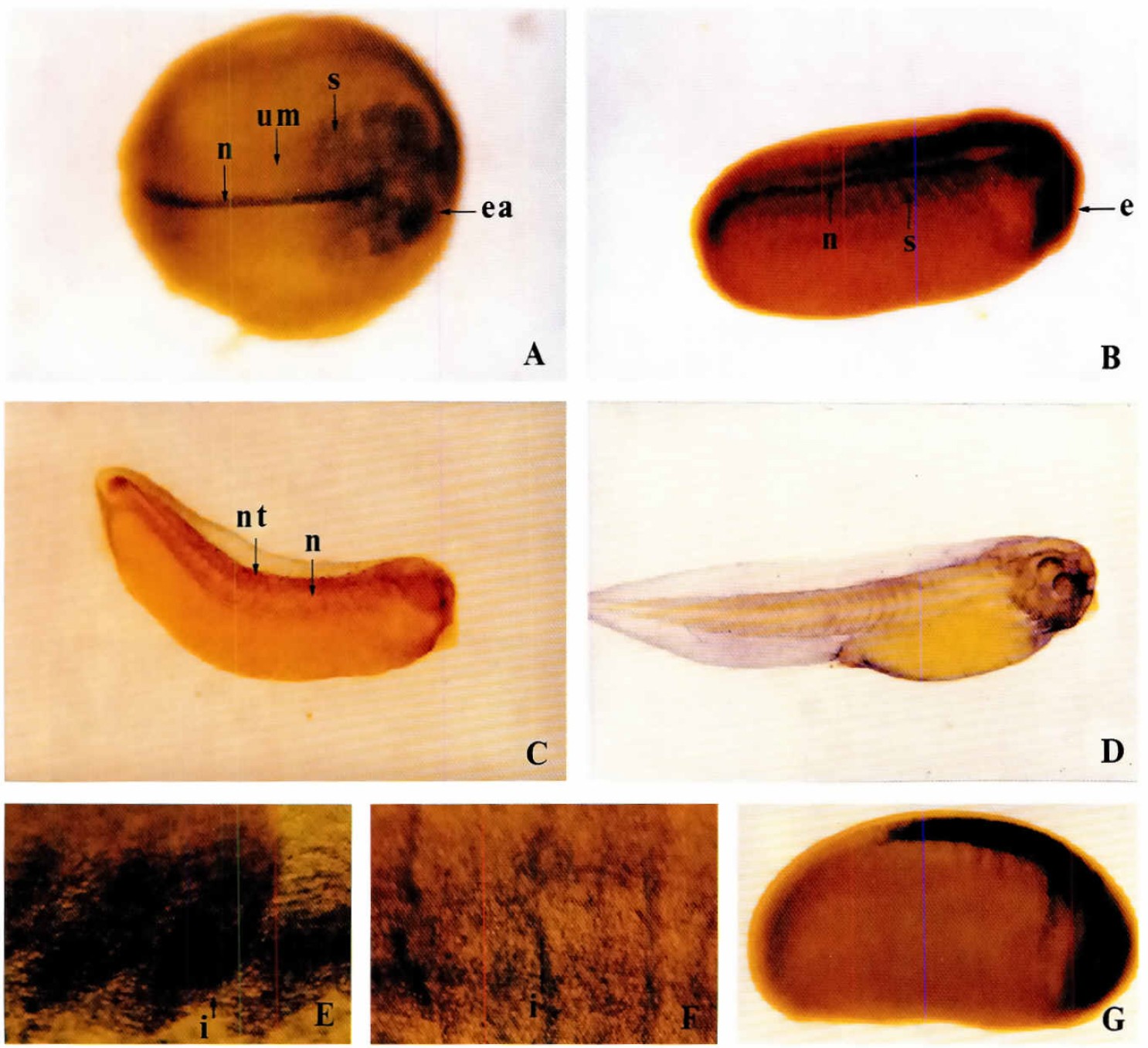 Fig. 1. Whole-mount in situ localization of SPARCRNA during early Xenopus development. A 460 bp EcoRI fragment of the 5' region of Xenopus