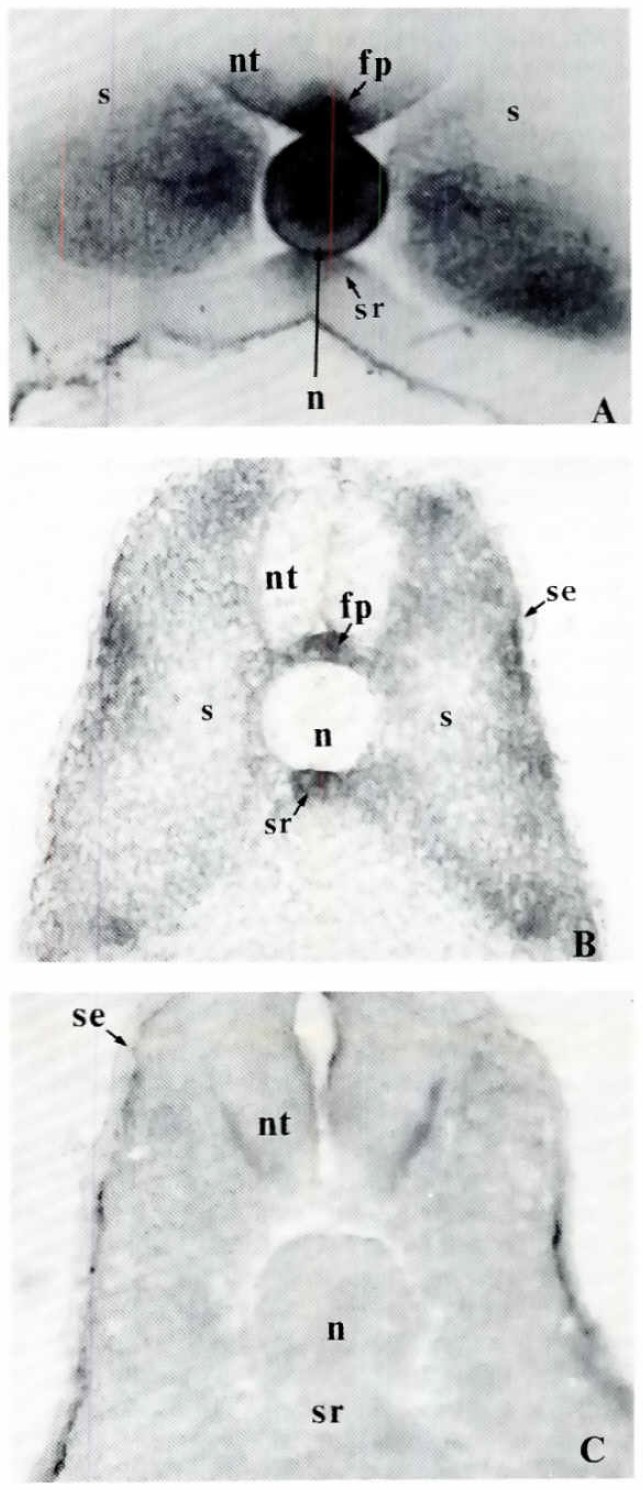 flanking somites (s). floor plate (fp) of the neural tube (nt), and the