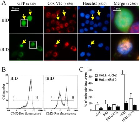 Figure 2. Xenopus laevis tBID localizes to mitochondria and triggers a drop of δÏm, which is inhibited by Bcl-2. Fluorescence analysis of HeLa-Bcl-2 cells transfected with CMV-BIDGFP (upper panel) and CMV-tBIDGFP vectors (lower panel). A: Green fluorescent protein (GFP) fluorescence of BID and tBID fusion proteins, immunostaining of the mitochondrial marker Cox VIc and morphology of nuclei stained with Hoechst examined under a fluorescent microscope (original magnification, Ã630). Right panel shows a merged picture (original magnification, Ã2,500) of the boxed cells of the left panel. The arrow in the lower Hoechst panel indicates the nuclear condensation and fragmentation of the cells. B: Mitochondrial membrane potential (δÏm) of GFP-positive transfected cells assessed by flow cytometry, using the CMX-Ros fluorochrome, 24 hr after beginning of transfection. Low δÏm corresponds to low fluorescence (L area), and high δÏm corresponds to high fluorescence (H area). C: Mitochondrial membrane potential (δÏm) variations in HeLa cells overexpressing or not bcl-2 after transfection of plasmids expressing GFP alone (control), BIDGFP, tBIDGFP, or their BH3 mutated relatives (G87A).Download figure to PowerPoint