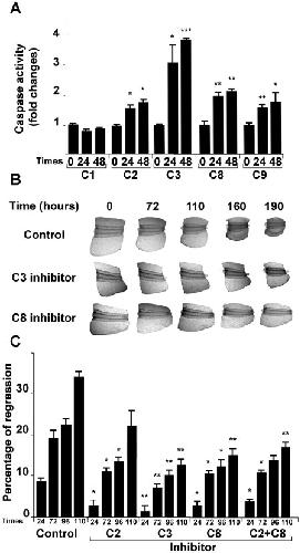 Figure 7. Caspases-2 and -8 inhibitors inhibit tail regression. A: Effect of T3 (10 nM) during 24 hr or 48 hr on caspases activities in ex vivo cultured tails from wild-type siblings tadpoles killed at stage NF55. Caspase activities were determined using fluorometric dosage. B,C: Effect of T3 (10 nM) with or without caspase inhibitors (100 μM) during 24 hr or 48 hr on tail regression of ex vivo cultured tails from wild-type siblings tadpoles killed at stage NF55. Tails were photographed at different times of T3 treatments (B), and the regression of the area of each tail was calculated (C). Means and SEM are shown, *P < 0.05; **P < 0.01; *P < 0.001; n = 3 for caspase dosage, n = 5 for tail regression. The figures represent one of two independent experiments with similar results.Download figure to PowerPoint