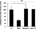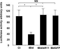 Figure 4. Validation of the protective effect of xR11 against tBID-induced apoptosis by somatic gene transfer in tadpole muscle cells. Cell survival measured by the luciferase activity (RLU) in muscle extracts 72 hr after transfection into the dorsal muscle of stage 56 tadpoles. Each group was injected with 200 ng of pcDNA3-LUC. In the Ct group, 1 ng of CMV-GFP and 1 μg of empty pCDNA3 were coinjected. In the tBID group, 1 ng of cmv-gfptbid and 1 μg of empty pCDNA3 were coinjected. In tBid/xR11 group, 1 ng of cmv-gfptbid and 1 μg of cmv-xr11 were coinjected. In the BID group, 500 ng of cmv-gfpbid and 500 ng of empty pCDNA3 were coinjected. Means ± SEM are given; n > 4 in each group. *P < 0.05; **P < 0.01; ***P < 0.001. The experiment was repeated three times providing similar results.Download figure to PowerPoint