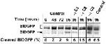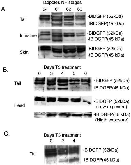Figure 5. BIDGFP cleavage during induced or spontaneous metamorphosis. Western blot analysis on total proteins extracted from metamorphic CMV-BIDGFP transgenic tadpoles tissues using a GFP antibody (molecular probes). A: Detection of the BID 45-kDa truncated form (tBIDGFP) during natural metamorphosis. Stage 54, premetamorphosis; stages 61 to 63, climax of metamorphosis. B: Detection of tBIDGFP in heads and tails of transgenic CMV-BIDGFP tadpoles in premetamorphosis (stage 42) maintained in water supplemented with 10 nM T3 for a week. For the heads, autoradiography exposure was 2 min for the BIDGFP band and increased to 120 min to enhance the faint tBIDGFP band (lower lane). C: tBIDGFP detection in ex vivo cultured tails of transgenic CMV-BIDGFP tadpoles (stage 57) 2 days and 4 days after continuous 10 nM T3 incubation.Download figure to PowerPoint