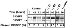 Figure 9. Caspase 8 activity is required for BIDGFP cleavage during tail regression. Effect of caspase inhibitors (100 μM) on tail regression of ex vivo cultured tails from wild-type sibling tadpoles killed at stage NF55, in the presence of T3 (10 nM) during 24 hr or 48 hr. Western blot analysis was performed on total proteins extracted from tails. Green fluorescent protein (GFP) -tagged proteins were detected using a GFP antibody (Roche). The asterisk indicates an unspecific band. The percentage of cleaved BIDGFP was determined by densitometry using Image J (Wayne Rasband, NIH). Caspase-2 inhibitor-treated sample and the control on the right were run on a separate gel. The data represent one of two independent experiments that gave similar results.Download figure to PowerPoint