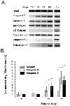Figure 6. mRNA Expression and activity levels of Xenopus caspases, calpain, and calpastatin during tail regression. A: Reverse transcriptase-polymerase chain reaction (RT-PCR) analysis performed on metamorphic tails at the indicated developmental stages (stage 56, premetamorphosis; stages 61 to 63, climax of metamorphosis). L8 ribosomal protein transcript was used to normalize the amplification products. Positives controls (C+) are analyzed by RT-PCR on laid eggs with the following exception: for Cl2-Calpain and Caspase 8, RT-PCR was performed on adult stomach, and for Calpastatin-3, RT-PCR was performed on stage 63 metamorphic tails. B: Fluorometric analysis of calpain and caspases-2 and -8 activities in tadpoles tails before (stage 54) and during metamorphosis (stages 58, 62, 63). Means ± SEM are given; n > 5 in each group. *P < 0.05; **P < 0.01; ***P < 0.001, compared with stage 54. The figures represent one of two independent experiments that gave similar results.Download figure to PowerPoint