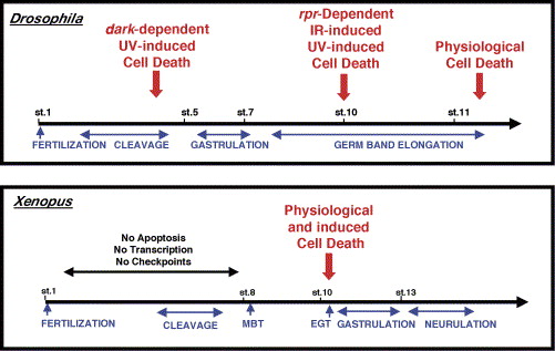 Acquisition of the ability to undergo stress-induced apoptosis is developmentally regulated. Early embryos of Drosophila and Xenopus are refractory to induced apoptosis. In Drosophila, several pathways could be involved in early apoptosis since the onset and the regulation of apoptosis varies with the type of stress used to trigger apoptosis. In Xenopus, all stress-induced apoptosis initiates at the early gastrulation transition (EGT), following the activation of zygotic transcription, the remodeling of the cell cycle and the acquisition of damage checkpoints. MBT: Midblastula transition.