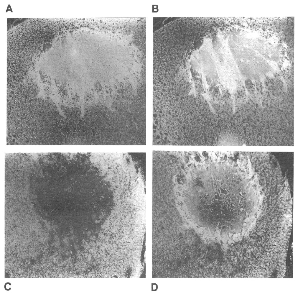 Figure 5. Indirect immunofluorescent localization of p4O-MO15 in stage VI oocytes. Acetone-fixed cryosections of stage VI oocytes were incubated with either M015-specific rabbit polyclonal antibody, together with a mouse monoclonal antibody to nucleoplasmin ( A and B) preimmune rabbit serum together with a mouse monoclonal antibody to nucleoplasmin (C and D). Rabbit antibodies were detected using alkaline phosphatase conjugated goat. antirabbit IgG, followed by incubation with Fast Red substrate and fluorescence viewed using a Rhodamine filter (A and C). Mouse antibodies were detected using FITC-conjugated goat antimouse IgG and fluorescence viewed using a fluorescein filter (B and D).