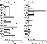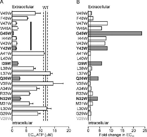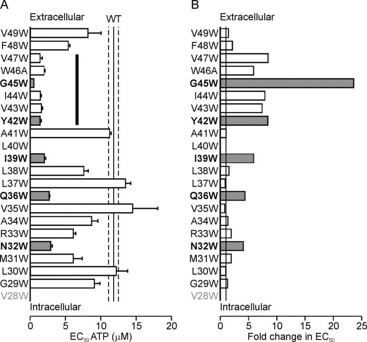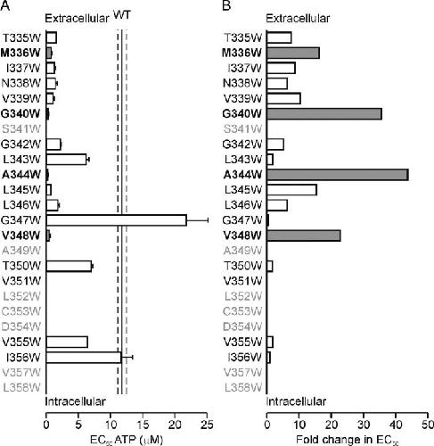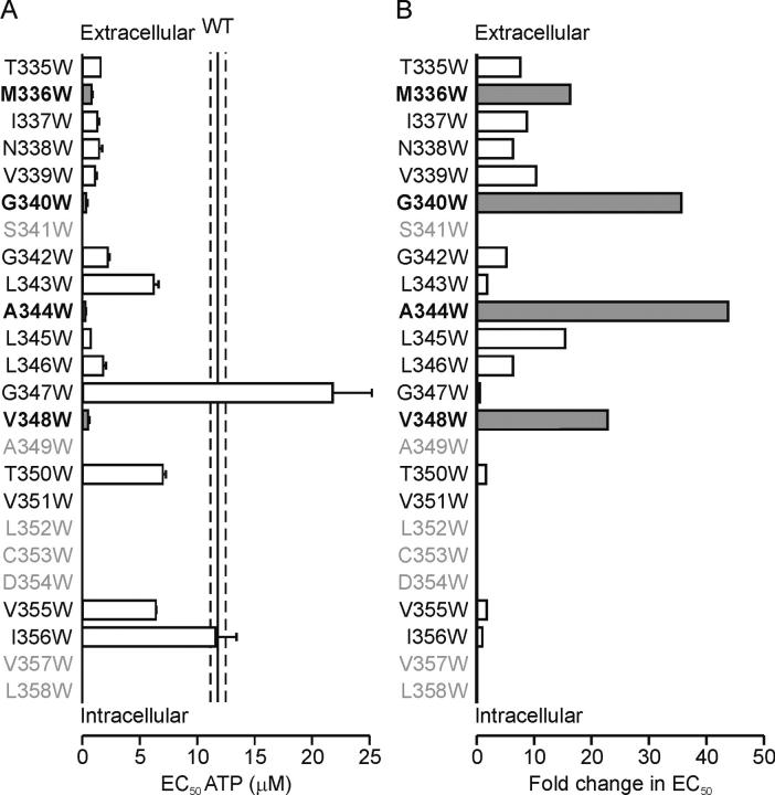 Figure 5. . Tryptophan substitution increases sensitivity to ATP in many positions in TM2. Estimated EC50 ± SEM (A) and fold changes in EC50 relative to WT (B) for each of the point mutations in TM2. Seven residues, six of which are toward the inner region of TM2, do not give rise to measurable currents (light gray typeface). A concentration–response relationship could not be determined for V351W. The mean ± SEM EC50 for WT is represented by a vertical line and vertical dashed lines, respectively. Toward the outer region of TM2 the perturbations in EC50 are large and the four mutants with the greatest perturbations are four residues apart. (bold typeface, full bars).