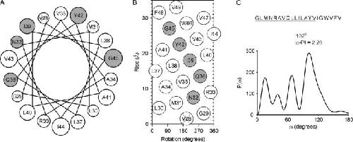 Figure 4. . TM1 is likely an α-helix. Helical wheel representation (A) and helical net diagram (B) of TM1. The residues in the helical wheel representation progressively decrease in size from the outer to inner ends of TM1 (residues W46–V49 are not shown). The residues labeled in bold typeface in Fig. 3 map to one face of a presumed α-helix. (C) Fourier analysis of the fold change in EC50 for the region of TM1 underlined above. The primary peak of the power spectrum occurs at 102°. The α-PI calculated from the spectrum is 2.26. The EC50 for L40W was taken to be 30 μM (see Table I).