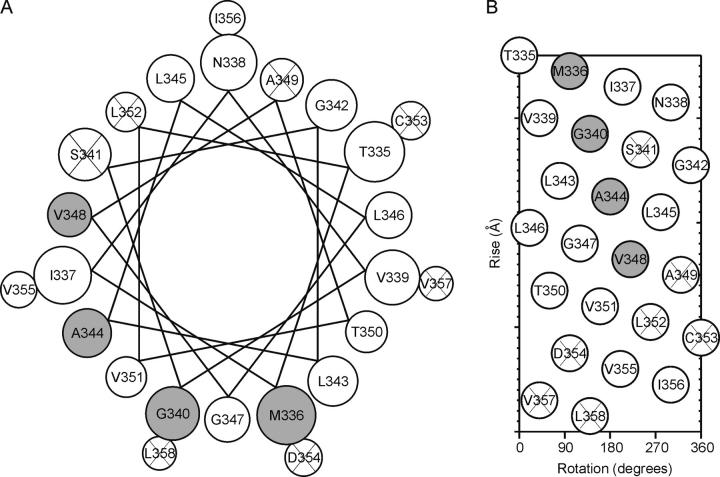 Figure 6. . The extracellular region of TM2 seems to be an α-helix. Helical wheel representation (A) and helical net diagram (B) of TM2. The residues in the helical wheel representation progressively decrease in size from the outer to inner ends of TM2. The residues labeled in bold typeface in Fig. 5 map to one face of a presumed α-helix.