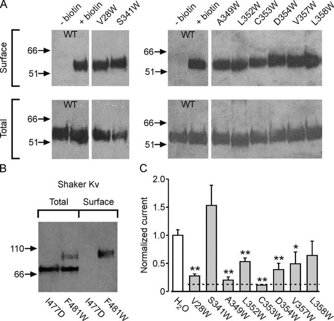 Figure 7. . All of the nonfunctional mutants form nonconducting channels. (A) Western blots from SDS-PAGE of P2X4 receptor channels obtained from surface membrane preparation (top) and total crude membrane preparation (bottom). Each lane contains the protein from an equivalent of 20 oocytes (surface) or 1 oocyte (total). All the oocytes expressing mutant channels were treated with biotin. The four left lanes and the eight right lanes are from two separate experiments. Numbers to the left are molecular weight markers in kD. (B) Western blots from SDS-PAGE of c-myc–tagged Shaker I477D and F481W protein obtained from surface membrane preparation (right two lanes) and total crude membrane preparation (left two lanes). Each lane contains the protein from an equivalent of 20 oocytes (surface) or 1 oocyte (total). F481W protein has two dominant forms, a core-glycosylated form (∼70 kD) and a mature form (∼100 kD). I477D exhibits only the core-glycosylated form. Numbers to the left are molecular weight markers in kD. (C) Mean ± SEM currents (averaged from 10 oocytes) from oocytes coinjected with 1:1 mixtures of cRNA for the WT and nonconducting mutant channel subunits. Oocytes injected with a 1:1 dilution of WT cRNA served as a control. The dashed line represents the expected current if the subunits randomly assemble to form trimers and a single mutant subunit prevents channel function. Significant differences between the control and each of the other groups was assessed with ungrouped Student's t test. *, P < 0.05; **, P < 0.001.