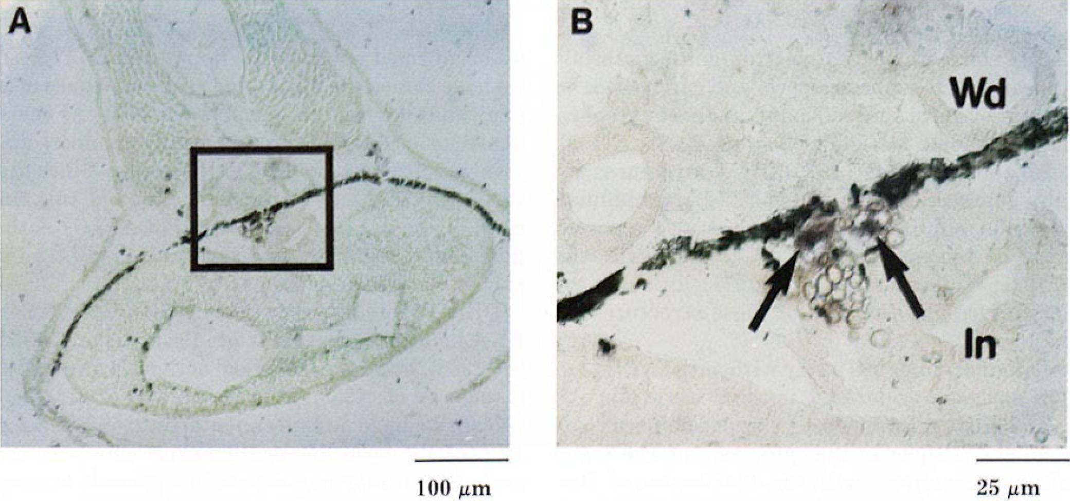having many yolk platelets inside, is stained. Most of the dark materia) is melanin, not stained. Wd, Wo)flian duct; In, intestine. (C-1) A