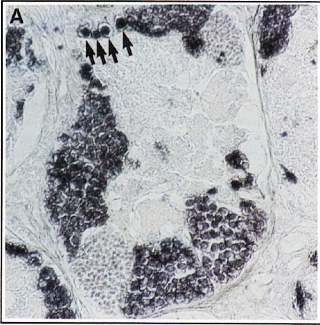 spermatogonium in the gonad which is positive by fluorescent microscopy in C-2. (C-2) The same section as shown in C-1 which was reacted with