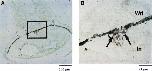 with AP-labeled second antibody. (B) A higher magnification of the rectangle in A. The cytoplasm of PGCs, located in the genital ridges (arrow)