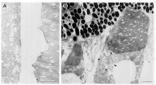 PE. Most outer segments are immunolabeled (arrows). However, some membranous material is unlabeled (arrowheads) indicating that it could
