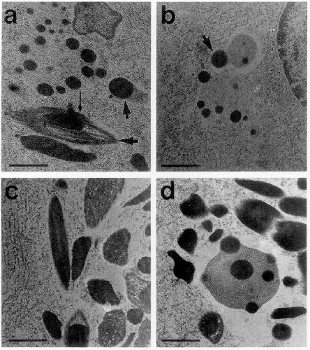 granules (a, c) and is not found in the cytoplasmic space between the granules. Thin arrow indicates gold particles (a). Broad arrow (a, b)