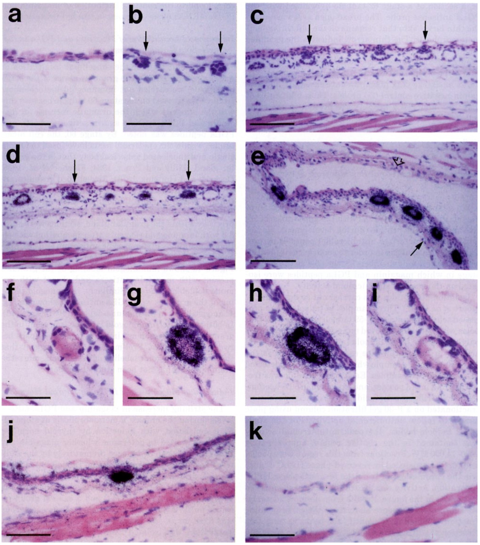 magainin mRNA is detected in the thin larval skin of the untreated, control tadpole (k). Bars: a, b, 50 pm; c-e, 100 I-'m; f- i, 50 p.rn; j, k. 65 J~ffi .