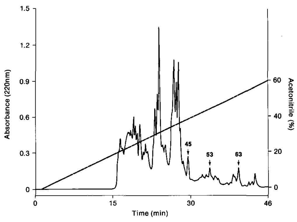 indicate fractions which were purified and sequenced. Solid line, absorbance; dashed line, percentage of acetonitrile.