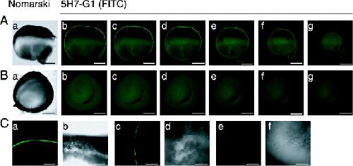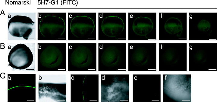 Spatial distribution of the mAb 5H7-G1 antigens in Xenopus egg before and after fertilization. Whole-mount immunocytochemistry was performed for (A) fertilized (60 min post insemination) and (B) unfertilized egg with mAb 5H7-G1 (1 µg/mL) as described in Experimental procedures. In each condition, a series of optical section (obtained with 50-µm intervals) from the bottom to the top of the dissected egg sample was visualized by fluorescent signal of FITC (b–g). Nomarski's images of the entire egg samples are shown in a. Bars are 250 µm. (C) Magnified images for a part of the animal hemisphere (a and b), the marginal zone (c and d), and the vegetal hemisphere (e and f) of fertilized egg specimens, as visualized by fluorescent signal of mAb 5H7-G1 and FITC (a, c, e) and Nomarski's interference (b, d, f). Bars are 62.5 µm.