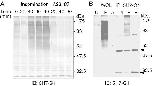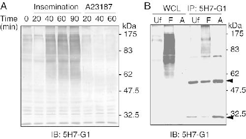 Time-dependent and fertilization-specific appearance of the mAb 5H7-G1 antigens. (A) Triton X-100-solubilized whole extracts (30 µg protein/lane) were prepared from Xenopus eggs at different times, either post insemination (0–90 min) or post A23187 treatment (20–60 min), and subjected to SDS-PAGE and immunoblotting with mAb 5H7-G1 (1 µg/mL). (B) Triton X-100-solubilized whole extracts from unfertilized (Uf), fertilized (F, 60 min post insemination), and A23187-treated eggs (A, 60 min at 0.5 µm) were analyzed by immunoblotting with mAb 5H7-G1 before (WCL, 30 µg protein/lane) or after immunoprecipitation with the same antibody (IP, 300 µg protein/lane). Arrowheads indicate the positions of IgG heavy and light chains used for immunoprecipitation.