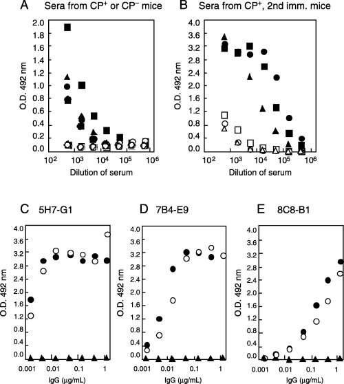 Characterization of subtractive antibodies by ELISA. (A) Sera were prepared from four mice that had received four rounds of immunosubtraction with unfertilized egg extract and cyclophosphamide (CP) treatment (opened symbols) and from four others that had received the same scheme of immunization without CP treatment (filled symbols), and were assayed for reactivity with Triton X-100-solubilized Xenopus unfertilized egg extracts using ELISA at the indicated serial dilutions (1 : 500–1 : 500 000). (B) Sera were prepared from four mice that had received second immunization after CP treatment and its clearing, and subjected to ELISA at the indicated dilution points for either fertilized egg extracts (60 min post insemination) (filled symbols) or bovine serum albumin alone (opened symbols). (C-E) Purified IgG were obtained from three different hybridoma clones; 5H7-G1 (C), 7B4-E9 (D), and 8C8-B1 (E), and subjected to ELISA at the indicated IgG concentrations for unfertilized egg extracts (opened circles), fertilized egg extracts (closed circles), or bovine serum albumin alone (filled triangles). All data points are the means absorbance at 492 nm.