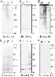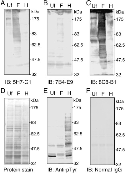 Fertilization-specific Xenopus egg proteome display as revealed by immunoblotting analysis with subtractive antibodies. Triton X-100-solubilized whole egg extracts (30 µg protein/lane) were prepared from unfertilized (Uf), fertilized (F, 60 min post insemination), or H2O2-treated eggs (H, 10 min at 10 mm) and separated by SDS-PAGE on 8% polyacrylamide gels. Proteins were analyzed by immunoblotting with (A) mAb 5H7-G1 (1 µg/mL) and (B) mAb 8C8-B1 (1 µg/mL) (C) mAb 7B4-E9 (1 µg/mL), (D) staining with Coomassie Brilliant Blue, (E) anti-phosphotyrosine antibody (PY99, 1 µg/mL), or (F) normal mouse IgG (10 µg/mL), as described in Experimental procedures. Prestained molecular size markers are maltose binding protein (MBP)-fusion β-galactosidase (175 kDa), MBP-fusion paramyosin (80 kDa), glutamic dehydrogenase (62 kDa), aldolase (47.5 kDa) and triosephosphate isomerase (32.5 kDa).
