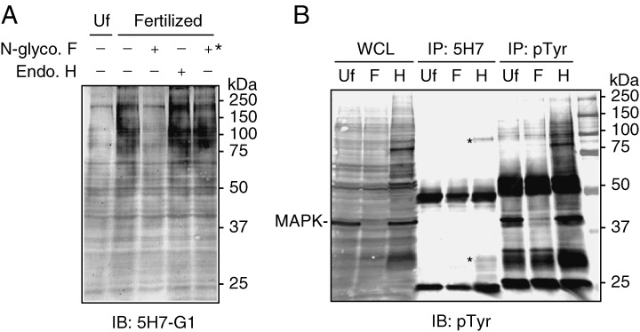 Inhibition of immunoreactivity of mAb 5H7-G1 to fertilized egg antigens using N-glycosidase treatment. (A) Triton X-100-solubilized whole extracts from unfertilized (Uf) or fertilized (F, 60 min post insemination) eggs were treated in the absence or the presence of N-glycosidase or endoglycosidase H as described in Experimental procedures. Effect of heat-inactivated N-glycosidase, as indicated by +*, was also examined. Reaction products (30 µg protein/lane) were analyzed by immunoblotting with mAb 5H7-G1. (B) Triton X-100-solubilized whole cell lysates were prepared from unfertilized (Uf), fertilized (F, 60 min post insemination), or H2O2-treated eggs (H, 10 min at 10 mm), and immunoprecipitated (IP) with mAb 5H7-G1 (5 µg/mL) or anti-phosphotyrosine antibody (PY99, 10 µg/mL). The immunoprecipitates (300 µg protein/lane) as well as the whole cell lysates (WCL, 30 µg protein/lane) were separated by SDS-PAGE on 10% polyacrylamide gels and analyzed by immunoblotting with anti-phosphotyrosine antibody (PY99, 1 µg/mL). The position of a 42-kDa MAP kinase (MAPK) is indicated. Asterisks indicate the positions of protein bands that are immunoprecipitated with mAb 5H7-G1 and recognized by PY99 in H2O2-treated eggs.