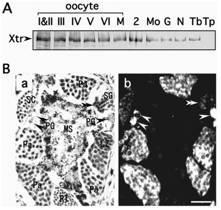 stained with hematoxylin/eosin (a) or anti-Xtr antibody followed