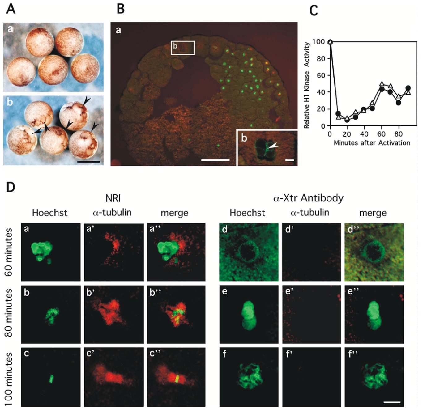 areas in (a). Arrowhead in (b) shows the partially condensed chromatin. (C) Effect on mitotic Cdc2 cycle. Unfertilized eggs were injected